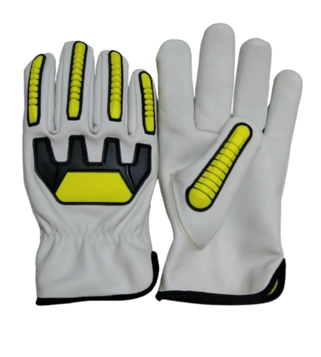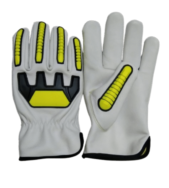 We integrated strong, two-tone ThermoPlastic Rubber (TPR) shields across all vulnerable impact zones. In fact, these flexible yet highly resilient shields effectively absorb and dissipate severe blows across the knuckles, metacarpals, and fingers. This is essential for safety during heavy equipment maintenance and rigging operations. Significantly, the bold Yellow TPR combined with the white leather ensures maximum high visibility on site. The palm uses Premium Grain Leather. This provides excellent abrasion resistance and a firm, secure grip.